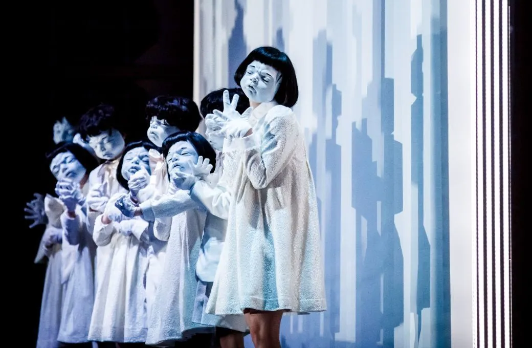Dancers and actors add extra colour (choreography by Jacek Przybyłowicz). There’s a twitchy, wounded falcon, and a “Golden Boy”, sent to seduce the Dyer’s Wife with his nifty moves and leather trousers. A group of children in doll-like white masks is used effectively, quietly threatening one moment, inspiring sympathy the next.