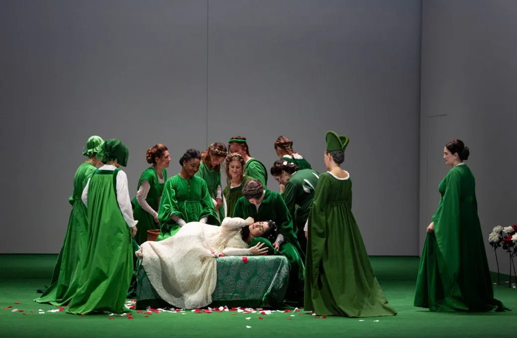 Pour cette nouvelle production, la construction du metteur en scène Stéphane Braunschweig est épurée mais redoutablement efficace : le cocon paradisiaque où est enfermée sans le savoir la princesse Iolanta est marqué de la couleur verte, tout comme les servants qui participent à la tromperie voulue par son père le roi. Ces derniers portent des tenues évocatrices de la période médiévale, par opposition aux personnalités extérieures, en vêtements plus modernes et essentiellement noirs.