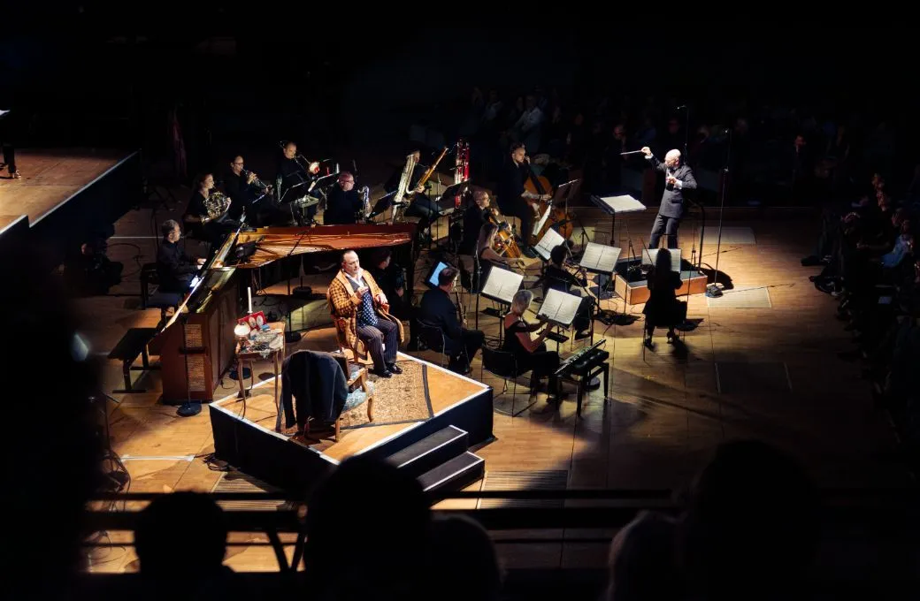 L’autre idée forte de la mise en scène aura été d’amener le ténor Peter Tantsits à prendre la baguette pour diriger l’Ensemble intercontemporain tout en chantant, lors d’un passage sur le Quatuor à cordes de Ravel. Cette impression donnée au spectateur d'entrer dans la tête de Ravel, de le voir déambuler au milieu de ses propres œuvres aurait pu être une façon de proposer une nouvelle lecture du roman d’Echenoz. Quoi qu'il en soit, les musiciens et leur (vrai) chef Pierre Bleuse mènent la musique de Lazkano au paroxysme de son expressivité durant tout l'opéra, tout en gardant la subtilité nécessaire à l’accompagnement des trois chanteurs.