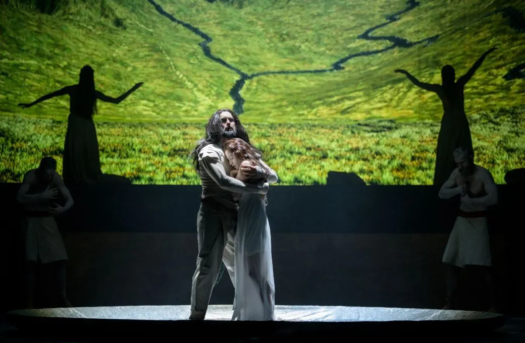 He is helped by a clever set (by Dragan Stojčevski) that frames the piece with a semicircular tiered wall overlooked by a large video screen, both containing and supplementing the narrative. Swooping footage of verdant landscapes rescues Kormac’s long opening monologue, though the screen is oddly underused after that, mostly as backlighting to silhouette dancers and figures striking symbolic poses. The primary lighting is less effective – sometimes it’s difficult to tell who is singing. Still, the overall impact of the set gives the production a larger dimension that it otherwise lacks.