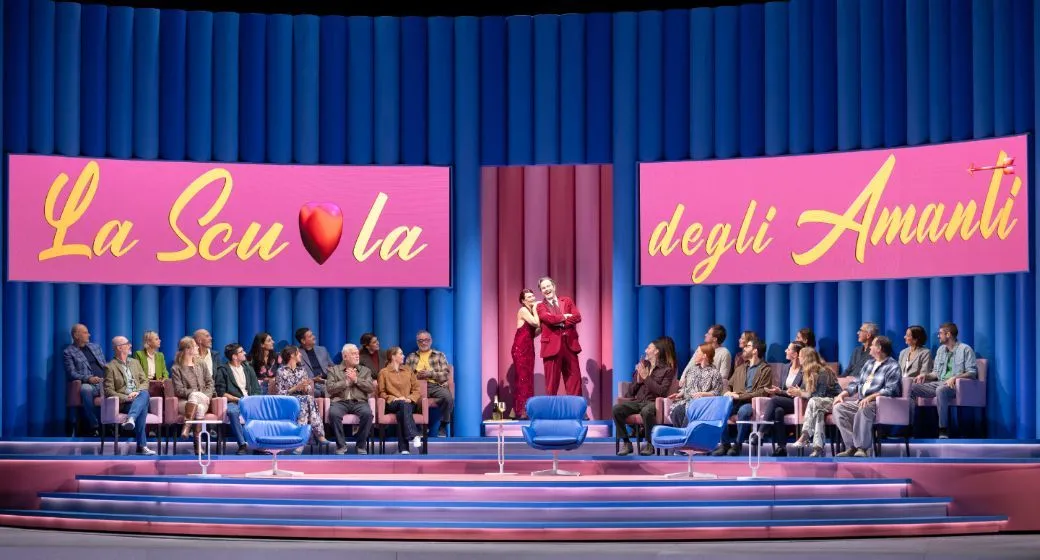 Given this premise, it is perhaps unsurprising that director Robert Carsen, in his first staging of the work, finds a parallel in the world of reality television. In his La Scala production, the two couples are contestants on a show titled “La scuola degli amanti” (the opera's subtitle), with the manipulative duo Don Alfonso and Despina orchestrating the fidelity test. A rotating platform reveals a garishly decorated, early-2000s TV studio with live audience, and, as it turns, it shows the different rooms of the house where the contestants live. This setting fits the story remarkably well, a testament to Carsen's expertise and profound understanding of theatrical space and dramatic action. The result is an extremely entertaining production that, without distorting the plot, successfully maintains the spirit of the characters.
