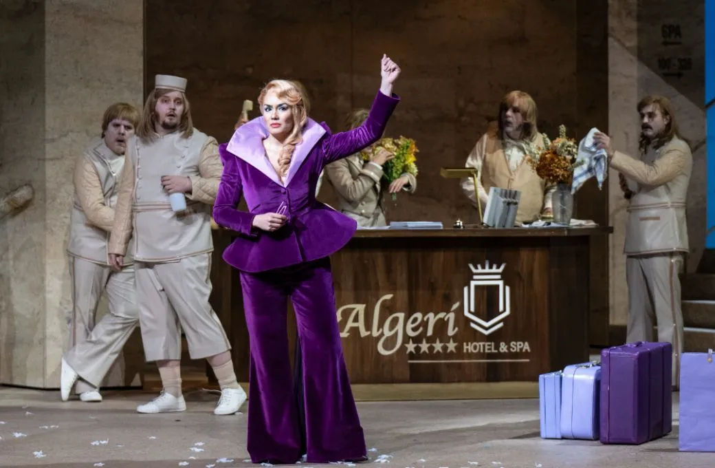 Die Umdeutung bringt erfrischend neue Perspektiven: Die von außen kommende Isabella bringt das despotische und patriarchale System Mustafas zum Auseinanderbrechen und etabliert am Schluss eine von herkömmlichen Zwängen befreite, von den Idealen der LGBTQ-Bewegung inspirierte Gesellschaft, die für Mustafà nur Hohn und Spott bereithält. Ganz im Dienst dieser Deutung stehen Szenerie, Kostüme und Beleuchtung. Amber Vandenhoeck zeigt im ersten Bild eine farblich blasse Empfangshalle, die an ein Interieur aus DDR-Zeiten erinnert. Dazu steckt Hannah Oellinger das Hotelpersonal in ebenfalls farblose Kleider, die jeden Individualismus im Keim ersticken. Bei der zirkusartigen Schlussszene, in der das Hotelpersonal seinem Direktor den Titel eines Pappataci verleiht, kommt in den fantastischen Kostümen der ganze Regenbogen des Farbspektrums zur Geltung. Dazu lässt Eloi Gianini die Wände der Hotelhalle in den leuchtendsten Farben erstrahlen.