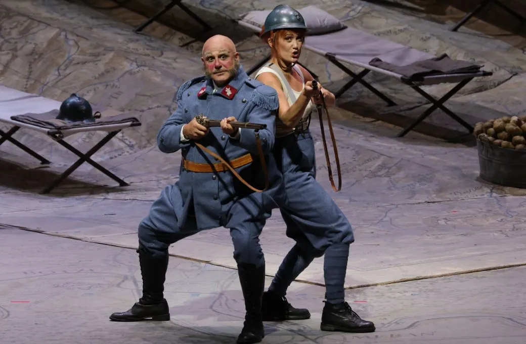 The director's decision to shift the setting from the Napoleonic era to World War 1 feels primarily like a bold stroke of theatrical flair to allow for the coup de théâtre of Tonio rumbling onto the stage atop a tank to rescue Marie from her dreaded wedding – a moment that feels like The Graduate on steroids.