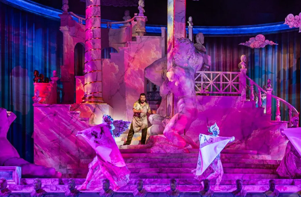 In his first engagement at La Monnaie, Thaddeus Strassberger elects a “timeless” approach to his production, dressing characters and the set with enough variety that it is easily understood that the audience should not try to situate the story in any particular era; a beautiful, elaborate rotating “marble” base settles us in Roman glory, while kitschy Vegas-style religious icons and neon lighting signal something vaguely contemporary.