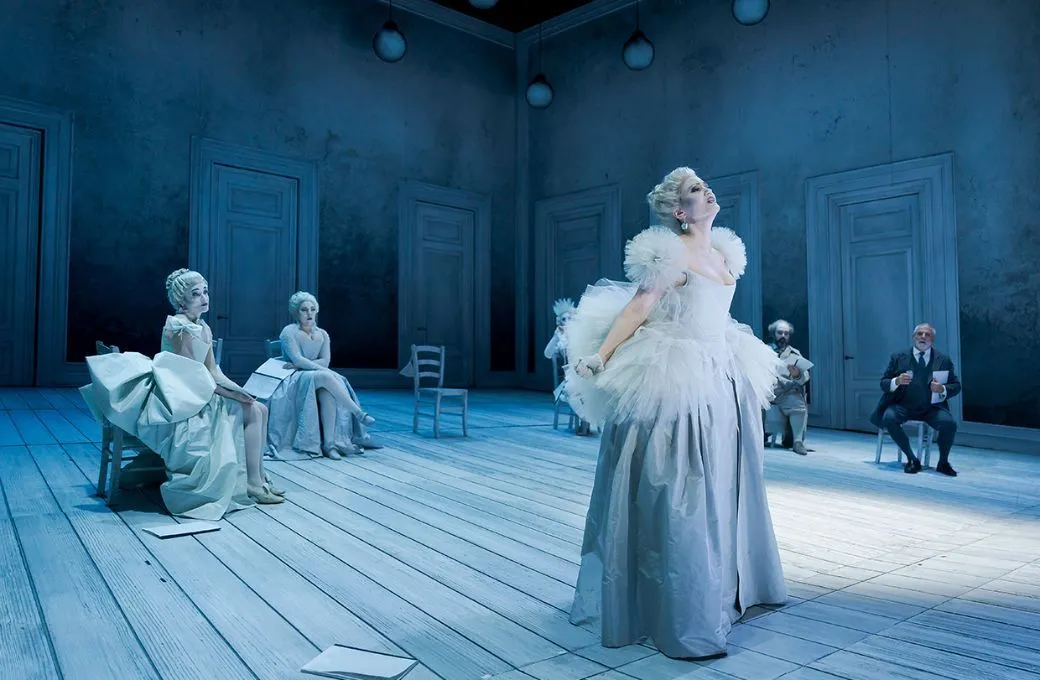 Die drei Sängerinnen tragen ein Einheitskostüm mit Krinoline, das sich nur in den Details unterscheidet. Wenn der Regisseur damit erzählen will, dass im Grunde alle gleich sind und sich in ihrem Streben nach Aufmerksamkeit nur in den Mitteln unterscheiden, ist das gelungen: Die Primadonna lebt ihren Diven-Größenwahn, die Junge rebelliert, und die chronisch unpässliche Smorfiosa vergisst ihre Wehwehchen sobald sie ihren Auftritt hat. Als letztere beeindruckte Andrea Carroll mit riesigem Stimmumfang, während Serena Gamberoni eine passend vorlaute Herausforderin gab. Julie Fuchs sang und spielte eine hinreißende Primadonna, die in der geprobten Todesszene vor lauter großen Gesten auf den Giftbecher vergisst.
