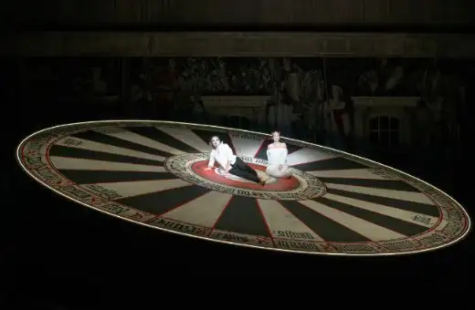 Le spectacle est confié à Jean-Romain Vesperini pour la mise en scène et Bruno de Lavenère pour les décors, les deux compères, déjà aux commandes de Dante en mars 2019, se chargeant également des costumes. La pièce maîtresse de la scénographie est un grand disque circulaire formant un praticable sur le plateau, mais pouvant aussi tourner et se soulever à l’aide de vérins. On reconnaît d’ailleurs le dispositif utilisé par le même scénographe à l’Opéra de Nice lors de deux de ses derniers spectacles, Akhnaten puis Phaéton, mais il faut avouer qu’il colle aujourd’hui parfaitement à la Table ronde des chevaliers du même nom.