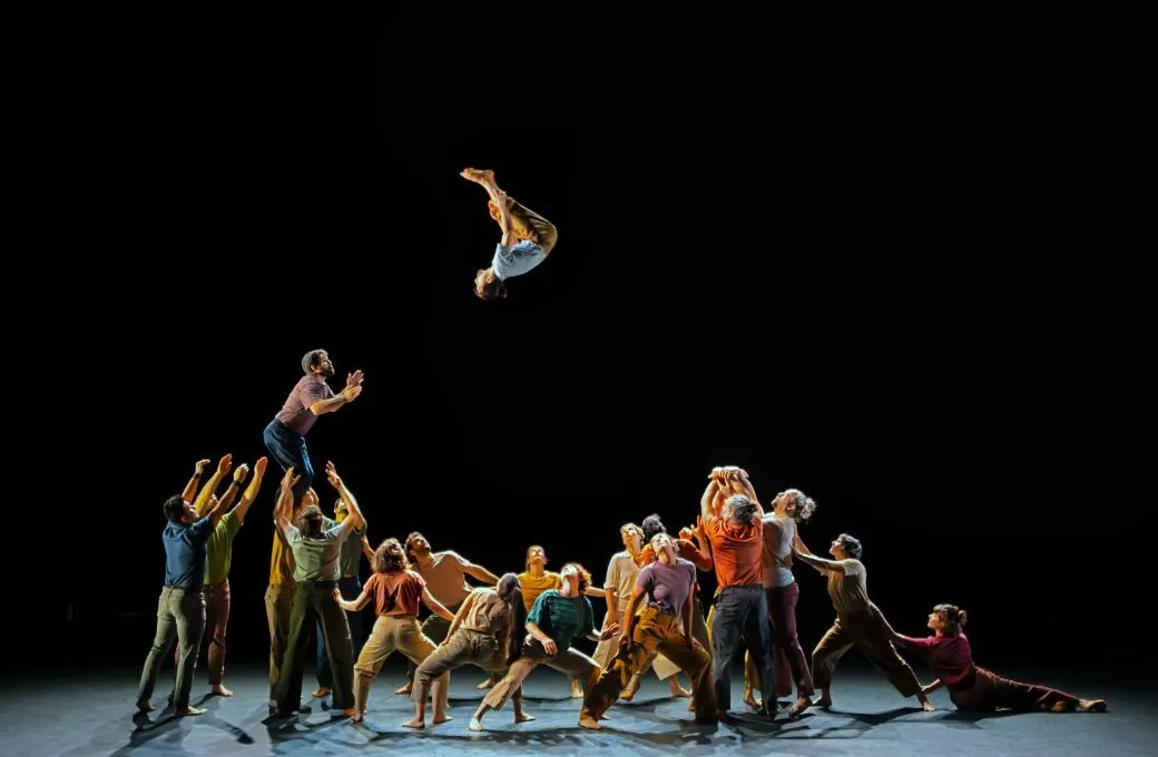 Pas de costumes remarquables, pas d’accessoires, pas de musique entraînante : la création proposée ici repose sur une scénographie d’une parfaite sobriété, laissant toute la place à l’expressivité brute des interprètes. Si les voix chantées (amplifiées par quelques micros) sont soutenues par une discrète bande enregistrée aux calmes sonorités électroniques qui se fait occasionnellement plus présente, le spectacle ne dépend jamais de ce qu’on entend : c’est la dynamique insufflée par le mouvement des corps qui rythme la progression du propos.