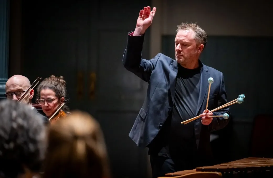 Written for string orchestra, with Currie playing marimba, vibraphone and crotales, Duddell’s abstract piece Snowblind was enthralling. With mallets in perpetual motion, Currie’s marimba blended with the strings, all long-bow chords to start but soloist and players developing bright sequencing passages, linked by the first violin, viola and cello, the double basses resonantly underpinning the mix. A slow movement explored vibraphone and crotales, their resonance cutting through the tapestry of densely interwoven strings, Currie’s approach keeping things light and airy. A final animated movement had loops and a jazzy feel, players fizzing with energy, especially when the violas launched into a crazy dance, Currie beating time briefly before returning to his whirl of mallets.