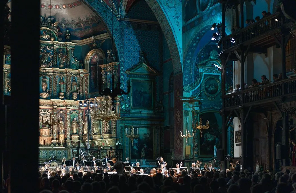 The settings for these concerts just get more and more outrageously stunning. This evening’s took place at the Église Saint-Jean-Baptiste with its monumental 17th-century altarpiece in carved gilded wood. The nave is framed by three-tiered galleries – precarious viewing perches – and all that wood makes for a wonderful acoustic, far from the over-reverberant stone that make English churches and cathedrals so unsuitable for much orchestral music.