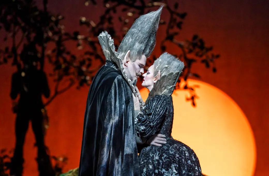 We begin where all stories find their mojo: in the woods. John Bury’s enchanted forest looms gradually out of the silence, as fresh and potent as it ever was, the dark foliage shape-shifting as the overture’s unmooring low portamenti slide us deeper and deeper into the uncanny. All ruffs, gauzy wings and weird hair, the Beatonesque fairy band arrive and recite their incantations. (Fairy diction isn’t quite what it was in Britten’s day, but there are surtitles.) Paul Pyant’s mesmeric lighting once again turns the moonlit clearing to a brilliant silver, and so the stage is set for proud Tytania and jealous Oberon, all decked out in Bury’s glorious Elizabethan glitz.
