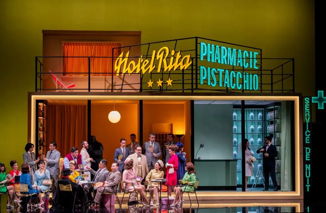 Director Stefania Bonfadelli takes the prudent decision to play both works on the same set, so Hotel Rita is next door to Pharmacie Pistacchio, but this risks overpopulating Il campanello especially, where she also gives the chorus way too much comic business, including a wedding guest in a gorilla suit. Much of her staging is deeply unfunny, although for Enrico’s second disguise – a hoarse singer – the decision to dress him up as Luciano Pavarotti, complete with scarf, Panama hat, oversized white handkerchief and fake beard – raised a chuckle.