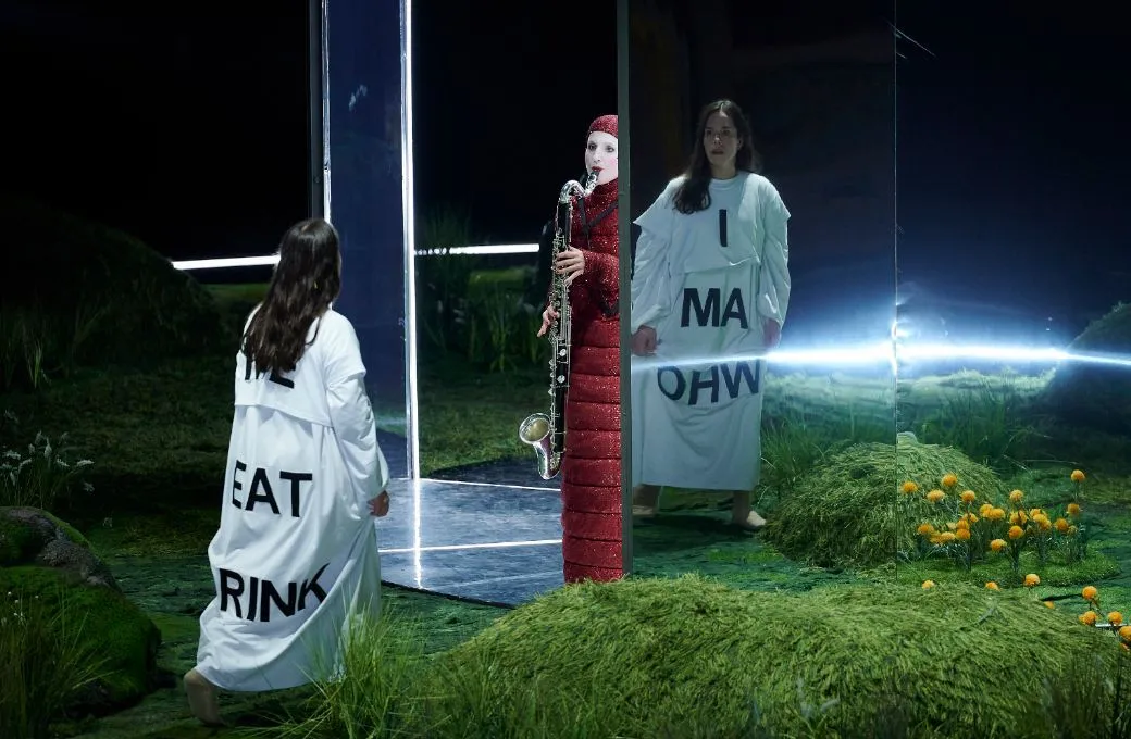 Der Graben birst vor lauter Schlagwerk aus allen Nähten. In die Logen darüber quetschen sich die mehrfach besetzten Holzbläser, wie als würde hier Mahlers Achte Symphonie aufgeführt werden. Doch auf der Bühne spielt sich deutlich Profaneres ab. Auf einer Drehschreibe kreist unerbittlich eine hügelige Graslandschaft, in der die verdrehte Logik von Unsuk Chins Oper Alice in Wonderland durchdekliniert wird.