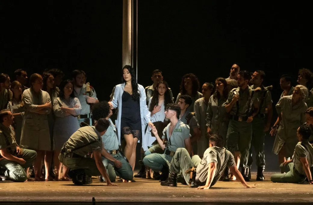 Bieito plantea una lectura sin concesiones, con una estética cañí y decadente, ambientada en el lado más áspero y fatalista de la España de la Transición. El minimalismo de Alfons Flores permite un movimiento fluido y un ritmo sostenido sin pausas, lo cual fue aprovechado a la perfección por el excelente trabajo de Lucía Astigarraga en la reposición de escena. Su labor milimétrica y detallada consiguió que todo estuviese coreografiado con precisión quirúrgica: coros, figurantes y protagonistas se integraron como engranajes en un dispositivo escénico que avanzó sin titubeos. El momento en que el toro de Osborne se desploma sobre el escenario es uno de esos golpes de efecto que definen a un gran director de escena como Bieito. Con él, el realismo más descarnado da paso al simbolismo en un cambio de paradigma que evocó su Rake’s Progress de Stravinsky en el Festival Mozart de 2010, donde el colapso de los hinchables funcionó con la misma potencia visual.
