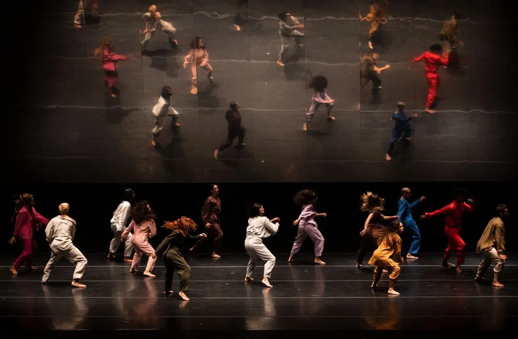 Alors que le rideau s’ouvre sur une brume qui semble elle-même frissonnante dans la pénombre, on découvre une petite vingtaine d’interprètes rassemblés au plateau, et leur simple présence, relativement calme au début, dégage instantanément une tension prometteuse. Les gestes d’une grande fluidité traversant de part en part ce groupe soudé viennent répondre aux mouvements de la musique diffusée (The Field / Joaquim Tomé). Cette musique électro, dont les vibrations diffusent un élan continu contagieux entre les danseurs, va se déployer de plus en plus et gagner en intensité tout au long de la pièce, avec quelques contrastes, parfois de courts répits, mais surtout des moments d’une frénésie hallucinante.