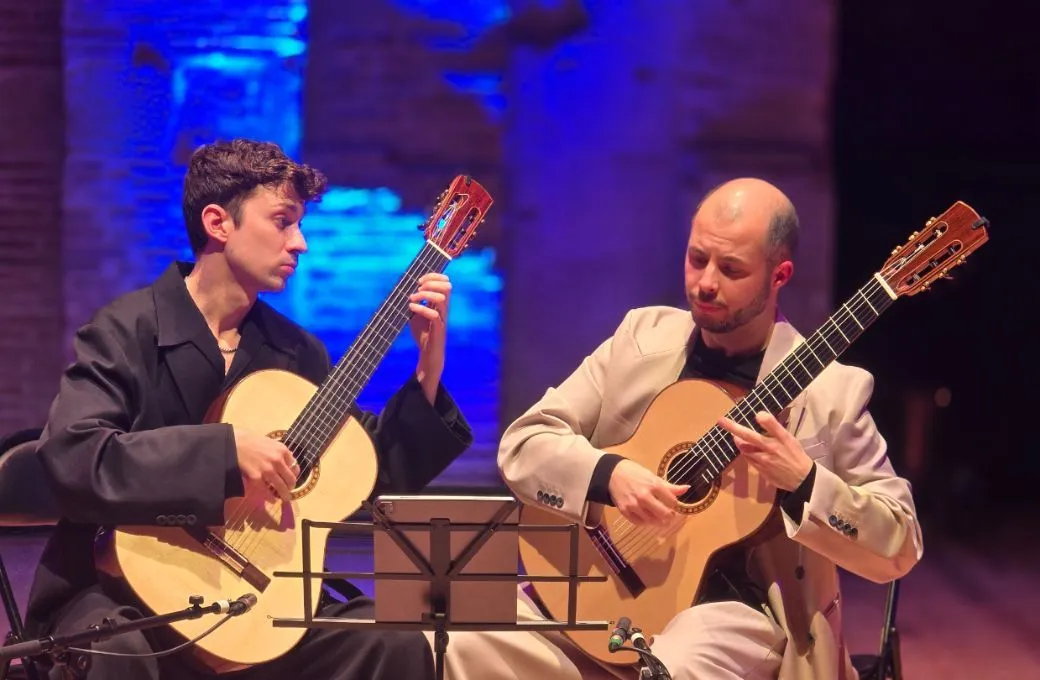 Sous les voutes en pierre du magnifique Auditorium Saint-Pierre des Cuisines, deux chaises sont posées au centre de l’immense scène. Les musiciens prennent le temps de s’installer, d’écouter le silence d’un public nombreux et attentif. L’« Aria » est sobre. Morinière chante avec douceur, quand Garcia assure une basse très lisible. L'homogénéité sonore est telle qu'on pourrait imaginer une analogie avec du piano à quatre mains, l’un en prima et l’autre en seconda. Sauf qu’ils ne sont pas sur le même instrument…