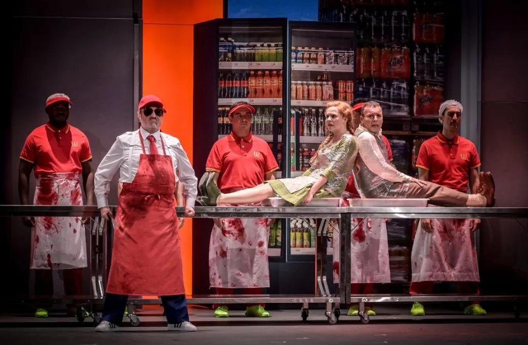 Après un acte I à manier au millimètre les codes boulevardiers sur un îlot petit-bourgeois des années 60, la mise en scène prend ensuite un virage satirique et subversif où Robinson quitte cette île pour s’échouer en sans-abri au pied de gratte-ciels, confronté à la jungle consumériste américaine : un fast-food qui travaille la viande à la chaine à l’acte II, puis sous les palmiers, peuplés de clones de Trump (engagement sans faille du chœur accentus), danseurs tribaux vénérant un Dieu « Saranha » supérieur, devenant ici culte de l’ultra-libéralisme. On quitte un humble confort pour une solitude moderne perdue dans la multitude : ce sont les deux mondes de Mon oncle de Jacques Tati qui se rejouent ici. Le renversement de la fable originelle est malin : les « sauvages » sont bien à chercher chez nous avant d’aller regarder à l’autre bout du monde.