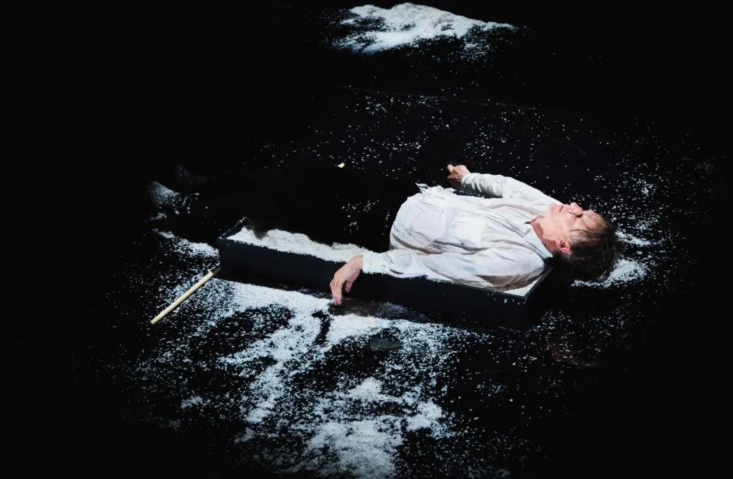 L’originalité de cette production du Voyage d’hiver tient dans sa mise en scène. Si l’habillement du cycle schubertien pose a priori question tant la force de son dépouillement musical se suffit à lui-même et contient déjà un pouvoir suggestif infini, la proposition de Deborah Warner réussit à dépasser la simple mise en espace artificielle. La direction d’acteur est exemplaire dans sa gestion de l’espace, tantôt énergique, tantôt statique mais toujours fluide et évidente, en accord avec le texte. Quelques éléments de décor illustrent certaines paroles sans en faire trop : la neige et la corneille bien sûr, le gravier des chemins, mais également une couronne verte mentionnée dans « L’auberge » ou encore une surface rectangulaire au sol qui se révèle une tombe glaçante.