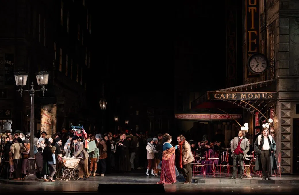 Bohème ist mehr noch als Hänsel und Gretel eine perfekte Oper für die Advents- und Weihnachtszeit. Das zweite Bild spielt an Heilig Abend im Pariser Quartier Latin, zum dritten Bild heißt es: „Überall liegt Schnee“. Rudolf Heinrich, Professor für Bühnenbild an der Münchner Akademie der Bildenden Künste, prägte neben Schenk die Ausstrahlung der Münchner Aufführung. Alles ist stimmig in Szene gesetzt, zeitlos, nicht überladen und doch mit vielerlei liebevoll eingefügten Details komödiantisch fein ausgestattet. Als optischer Hochgenuss überrascht die stilvolle Nachbildung der Haussmann-Fronten in den Straßenschluchten des Quartier Latin, quirlig agieren Straßenhändler, Artisten, Soldaten, Verliebte vor den Straßencafés des Künstlerviertels.