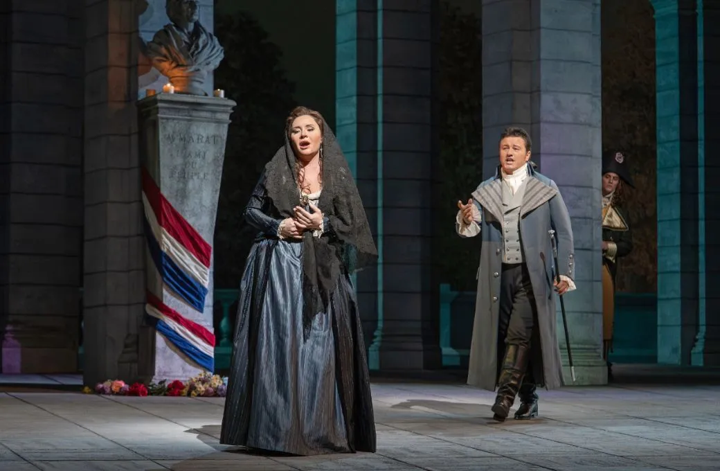 In this revival’s opening night performance, Hubert Monloup’s huge, heavily symbolic sets and elaborate costume designs looked more glamorous than remembered. But with fine work from the chorus and the orchestra’s excellent rendition of Giordano’s lush and stirring score led by Daniele Rustioni, the evening was more notable for its standout singing and orchestral playing than for its stage dressing.