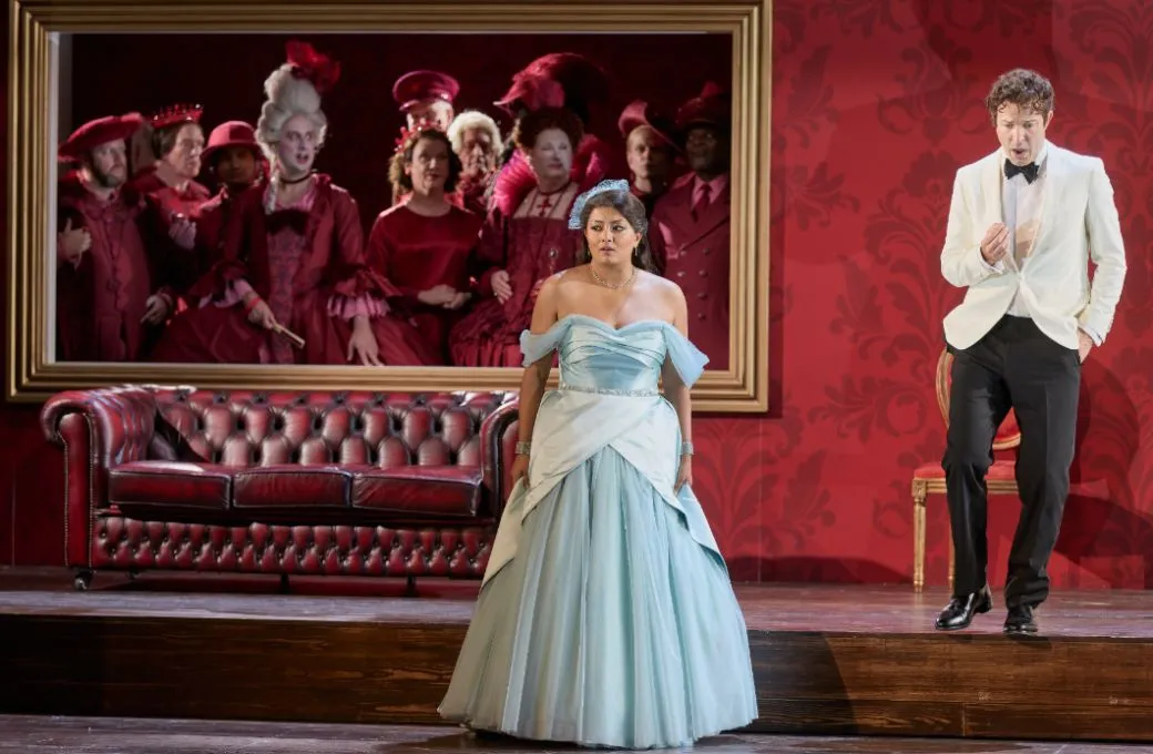 There were musical delights to savour – about which more later – but first, without getting too technical about it, we need to consider why the comedy fell so flat that not even ENO’s first-night guest list could lift it. Let’s start with some fundamentals. Almost all the action is played out in the mid-stage area against a flat-backed, multi-level set while the power locations downstage languish unused. This poor design choice not only damages the characters’ relationship with each other and their collective relationship with the audience, it has a deleterious impact on audibility, especially when debut conductor Yi-Chen Lin sends the ENO Orchestra into overdrive under the patter numbers.