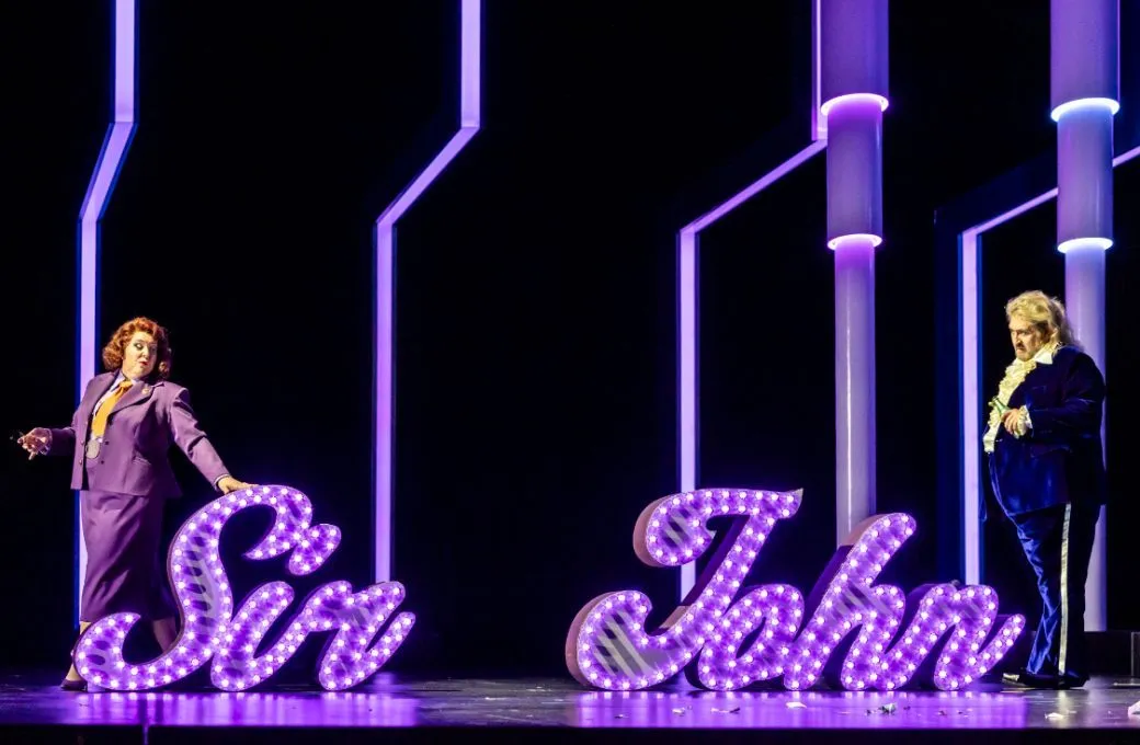 Das szenische Setting von Damiano Michieletto, Paolo Fantin und Agathe MacQueen soll uns in die Welt des Showbizz versetzen, in der Falstaff als Sir John wohl schon vor längerer Zeit mit seiner E-Gitarre herumgetingelt war. Doch nun ist seine beste Zeit vorbei, nur noch ein altes Plakat von früher kündet von seinen Erfolgen. Und eine Schallplatte seiner Glanzzeit hat er auch noch zu verschenken. Ein abgehalfterter Popstar – so ganz abwegig ist das für diese Figur eigentlich nicht. Aber es bringt auch keinen weiteren Erkenntnisgewinn, zumal die überaus karge Bühne, die hauptsächlich aus sich nichtssagend bewegenden Säulen besteht, keine große Ausstrahlung entfaltet. Die Zauberwaldszene ist als Revuenummer arrangiert; mit ausladenden Federkostümen für die Damen. Aber ob beim Spuk der Geister die versammelten Altersheimbewohner Falstaff so richtig zu piesacken vermögen, ist eigentlich nicht recht ersichtlich. Nicht mehr als ein Gag bleibt auch, dass Fastaff am Ende des zweiten Akts nicht im Waschkorb in die Themse gekippt, sondern von oben aus einem Container mit leeren Bierdosen zugeschüttet wird. Alles nicht ganz neu und im Vergleich zur subtil austarierten musikalischen Gestaltung auch leider etwas platt.