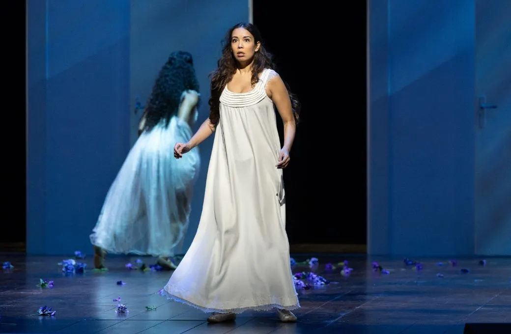 This retelling is set in a strict, rule-bound society. Johannes Leiacker’s static set design visualizes Amina’s cramped, claustrophobic world by dividing the stage into two halves. In the upper half, Renaud Rubiano’s majestic projection designs depict a rugged, high-altitude alpine landscape with snow-capped glaciers; the lower half is a stark, windowless room with a few narrow tables and nine closed doors. The only escape from this dreary underworld is by way of a ladder leaning against the rear wall. The single set remains in place throughout the opera, taking on a more surreal air at the opening of Act 2, with a rumpled, lopsided bed suspended over the room and one of the doors turned askew and marked with a huge black “X”.