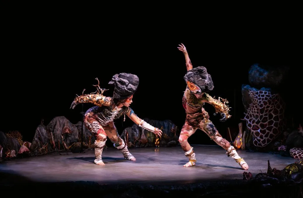 He sings and improvises beats with different foot positions, holding the robe with his long-nailed hands to show off his legs. We see them at the top of the rock, wearing golden gloves with roots or branches growing out of them, squabbling in slow motion. We then see them dancing the tango while the musicians parade playing underneath the rock. Finally, as they remove their headpieces, we enter the realm of dreams and desire. What should the future look like? We are invited to join in by clapping our hands to keep the rhythm as the musicians and performers dance and play on top of the rock looking out at the audience.